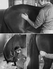 Stress patterns or compensation patterns between the horse and rider can also be picked up from one session to the next. Rolfing Structural Integration for the rider or specific muscular balance training through the use of pilates exercise training can help to create a stronger, more stabilized core from which the body can move in balanced muscle use.